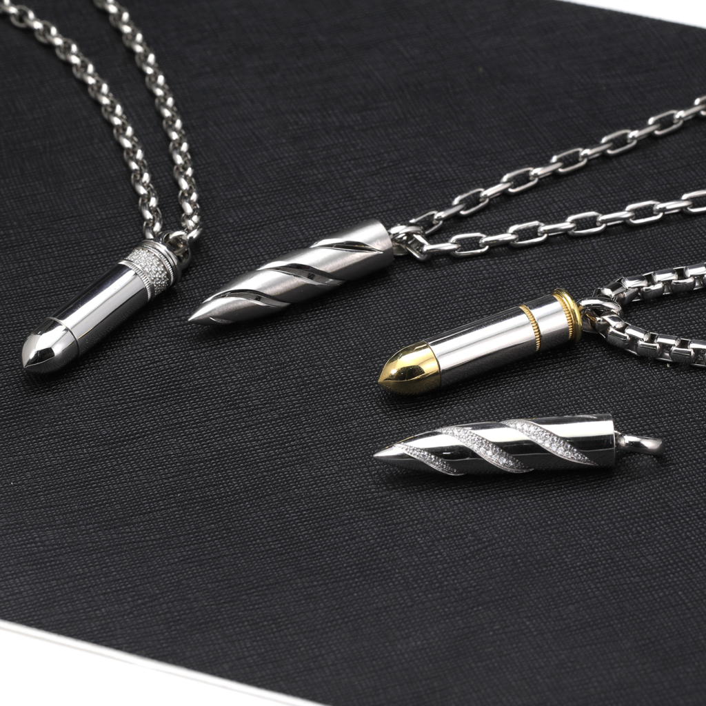 The Platinum Bullet Pendant is a collection of jewelry that exudes personality and strength. With its bold design, it is the perfect jewelry for individuals who want to make a strong personal statement. Moreover, the bullet-shaped pendant is meticulously crafted with sparrow patterns, adding a touch of elegance and individuality. Additionally, we offer a diamond setting option, allowing you to add a touch of personalization to the bullet pendant.